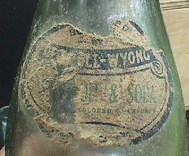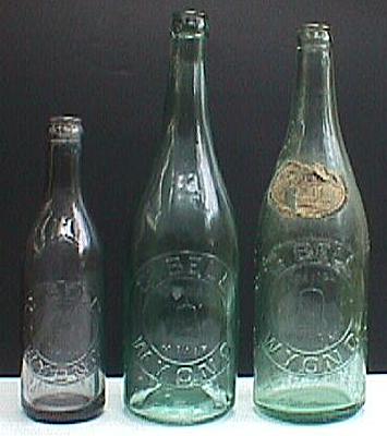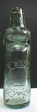 Left: 10 ounce Bulb Neck, Codd patent. Found on back near base: "THIS BOTTLE IS THE PROPERTY OF G. BELL WYONG" Triangle mark on base. Clear glass. Made with two-part slip mould, therefore forming extra seam lines around logo area on front and around lettering on back Marble rolls to center of neck. *7 ounce - unknown? Note: Only a few examples known to date. |