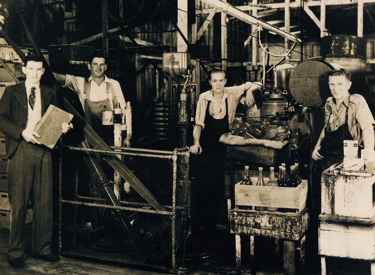 J.S. Dunk (son of Ben Dunk) stands second from left, with right hand resting on bottle cases.