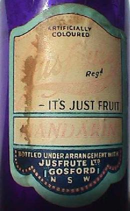 A. 26 ounce 'squat brandy shape'. Clear glass. Embossed around bottle at base: "THIS BOTTLE IS THE PROPERTY OF JUSFRUTE PRODUCTS LTD GOSFORD". Curved "A.G.M." on base. *Also available in 2 gallon Gosford flagon. Acid etched in large letters: "Jusfrute" (Not shown). *1 gallon Gosford Jusfrute flagon - unknown? B. 7 ounce. Ceramic transferred label. Label at back reads: "THIS BOTTLE REMAINS THE PROPERTY OF JUSFRUTE LTD. GOSFORD". (see close up below, left) C. 26 ounce. As above. D. 13 ounce. Clear glass. Embossed around bottle at base: "THIS BOTTLE IS THE PROPERTY OF JUSFRUTE PRODUCTS LTD GOSFORD". Curved "A.G.M." on base.