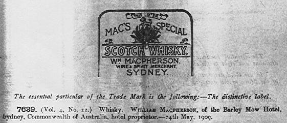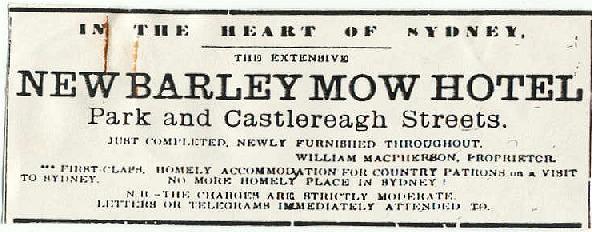 The first reference to this hotel that I have found is in 1831 - with reference to Catherine McLeod, Publican, Barley Mow, Castlereagh St. It is then listed through the years until 1889, when William Macpherson became the publican. He remained until 1914. The hotel was still operating in 1951, and at that time was called the Barley Mow Family Hotel.