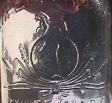 Close-up of rare "BARLEY MOW" embossing as found on A. and C. above. (note: not found on many Imperial Pint examples and not found at all on the Imperial Quart bottles). |