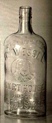 Imperial Pint flask. Clear glass, applied top. Rare. A judge's head motif appears on front of bottle. Embossed on front: "PINT H.S. WESSEL COURT HOUSE HOTEL OXFORD STREET". |
