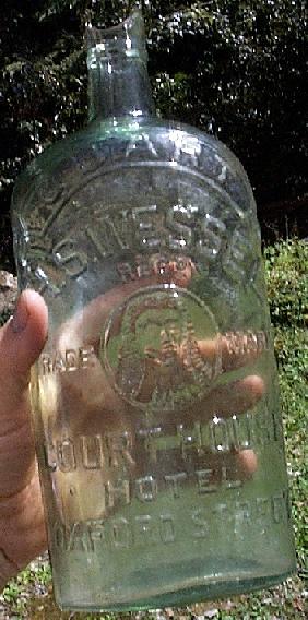 Imperial Quart flask. Clear glass, applied top. Extremely rare. A judge's head motif appears on front of bottle (see close-up below). Embossed on front: "QUART H.S. WESSEL COURT HOUSE HOTEL OXFORD STREET". Note: About two examples known to date, including this (broken) example. Found on the ground in 1999 by a very lucky, amateur collector... Private collection.