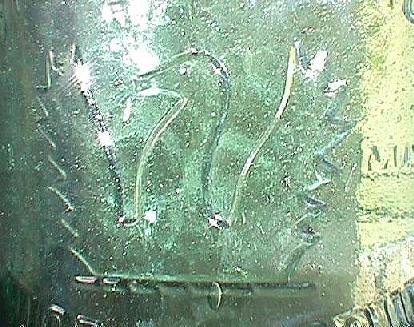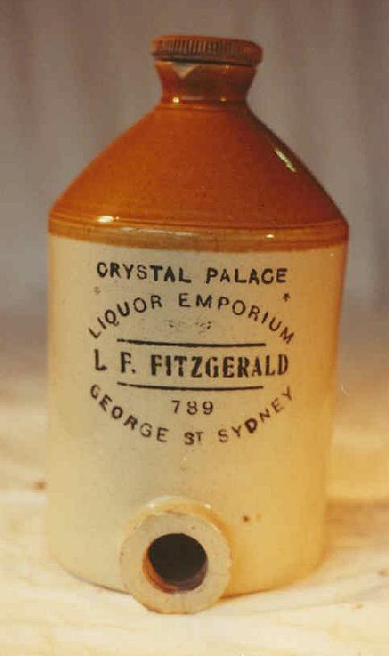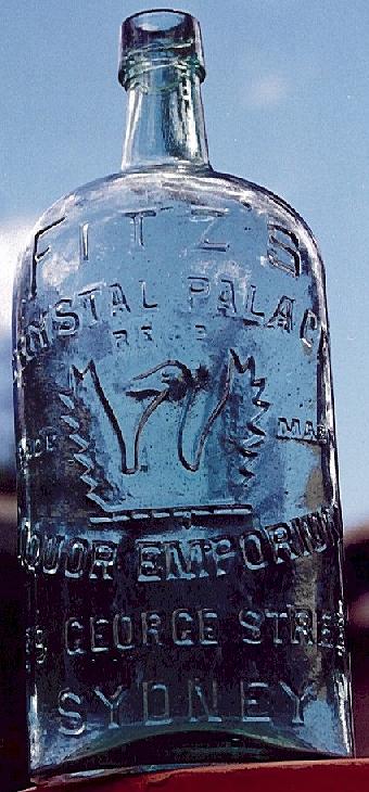 Imperial Quart. Clear glass, applied top. No maker's name. Trade mark - griffon. Embossed on front: "FITZ'S CRYSTAL PALACE TRADE MARK LIQUOR EMPORIUM GEORGE STREET SYDNEY". Note: At time of launching this website in September, 2001, there was only one example known of this bottle. However, the following article appeared in The Australian Bottle & Collectables Review (Oct/Nov/Dec 2002. P.5): "Kerran Howe from up Deniliquin way went out to bag himself a few rabbits for the evening meal. Permission to shoot on a property that had proved to be a dud for bottles years earlier was granted. Near the location of a long gone outstation some 10 km from the main homestead, Kerran noticed a Codd bottle that had been uncovered by recent winds laying at the base of a sandhill. It was a common Deniliquin Codd. Rabbits were forgotten as several bottles were scratched out of the sandhill. Mainly common run of the mill ring seals, imperials quarts and common Codds. Amongst these was one whisky, which was a Fiz's from Sydney." Thus, at least a second example is now known....