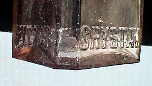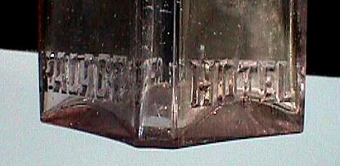 Quarter pint spirit bottle. Square sided and similar in appearance to a small schnapps. Clear, applied top. Extremely rare. Embossed on sides near base: "FITZ'S CRYSTAL PALACE HOTEL".