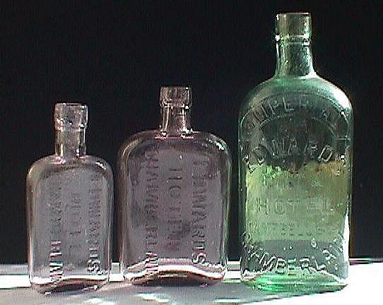 A. Quarter pint flask. Clear and amethyst glass, applied top, rare. Embossed on front: "EDWARD'S HOTEL CHAMBERLAIN". B. Half pint flask. Same as above except rarer than quarter pint. C. Imperial Pint flask. Clear and amethyst glass, applied top. Rare. Also available in Imperial Quart size. Embossed on front: "IMPERIAL EDWARDS PITT & HOTEL CAMPBELL STS CHAMBERLAIN".