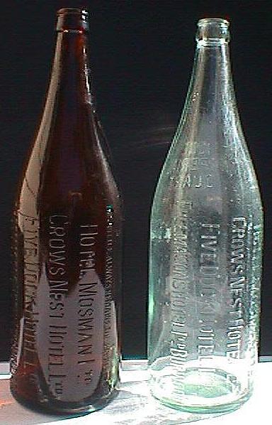 A. Imperial Quart beer. Amber glass, crown seal, seam through lip, curved "A.G.M." on base. Common. The embossing shows four hotels: "THIS BOTTLE ALWAYS REMAINS THE PROPERTY OF HOTEL MOSMAN LTD CROWS NEST LTD FIVE DOCK LTD FREEMASONS HOTEL LTD BURWOOD". B. Same in clear glass. Common. |