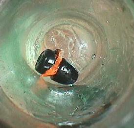 Looking 'down the barrel' of a 7 ounce Mullard. Lamont stopper still in place, despite 110+ years in Brisbane Water's sea water. Note rubber ring for sealing purposes. Note reverse embossing of RCB logo on bottom.