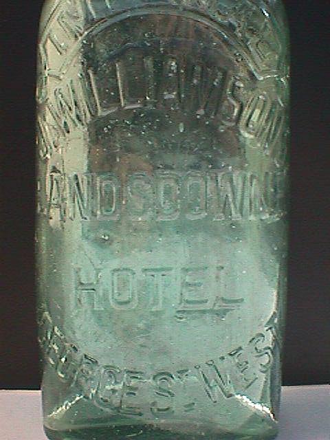 Imperial Pint flask. Clear glass, applied top. Only one example known to date. Embossed on front: "IMPERIAL J. WILLIAMSON'S LANDSDOWNE HOTEL HOTEL GEORGE ST WEST". |