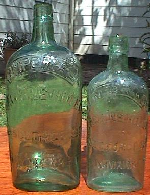 Left to right: A. Imperial Quart flask. Clear glass, applied top. Extremely rare. Embossed on front: "IMPERIAL LARKINS HOTEL 655 GEORGE ST HAYMARKET". On back: "QUART". B. Imperial Pint flask. As above, but "PINT" on back near shoulder. Only one example known to date. Somewhat difficult to photograph embossing.