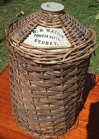Left: W.H. Watson two gallon Demi-john. Wickerware surround. Extremely rare. Right: Close-up of ink stamp. Above, bottom: Left: Base of wickerware surround. Right: Close-up of burned-wood lettering as found on center of base.