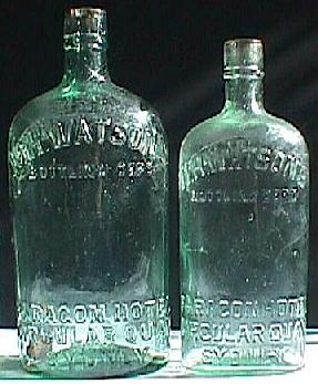 A. Imperial Quart. Clear glass, applied top. Rare with "1923" embossed on front: "W.H.WATSON'S BOTTLING DEPT PARAGON HOTEL CIRCULAR QUAY SYDNEY 1923". (see close-up below). Note: Embossed near base with "1919" or no dates at all - common. B. Imperial Pint. As above, but no embossed date. |
