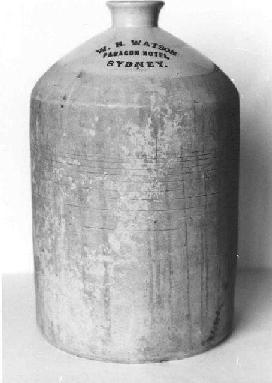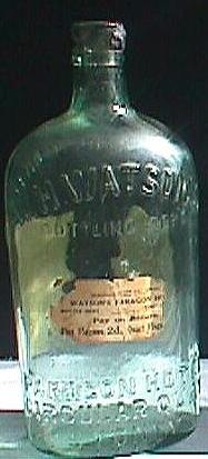 Four ounce spirit bottle (shaped like a coffee essence bottle). Clear or amethyst glass, applied top. Rare. Embossed on front: "W.H.WATSON WINE & SPIRIT STORE CIRCULAR QUAY". |