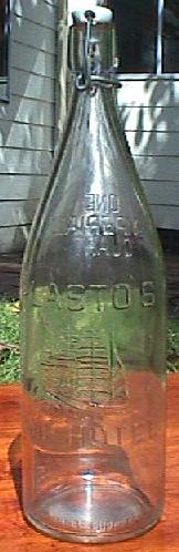 Quart. Clear glass, machine-made. Common. Lightning stopper. Embossed on front: "PLASTO'S SHIP HOTEL". |