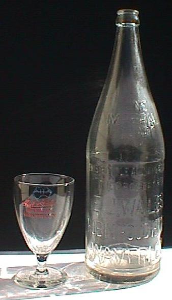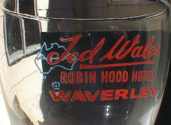 A. Wine glass. Embossed: "TED WALES ROBIN HOOD HOTEL WAVERLEY". (See close-up below). B. One Imperial Quart beer. Clear glass, crown seal, seam through lip, curved "A.G.M." monogram on base. Although not very old, hard to find. Embossed on front: "ONE IMPERIAL QUART THIS BOTTLE ALWAYS REMAINS THE PROPERTY OF E.J. WALES ROBIN HOOD HOTEL WAVERLEY".