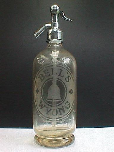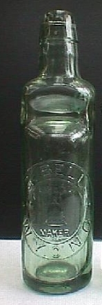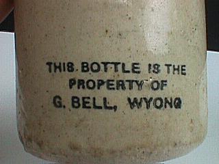 Left: 10 ounce Bulb Neck, Codd patent. Found on back near base: "THIS BOTTLE IS THE PROPERTY OF G. BELL WYONG" Triangle mark on base. Clear glass. Made with two-part slip mould, therefore forming extra seam lines around logo area on front and around lettering on back Marble rolls to center of neck. *7 ounce - unknown? Note: Only a few examples known to date. |