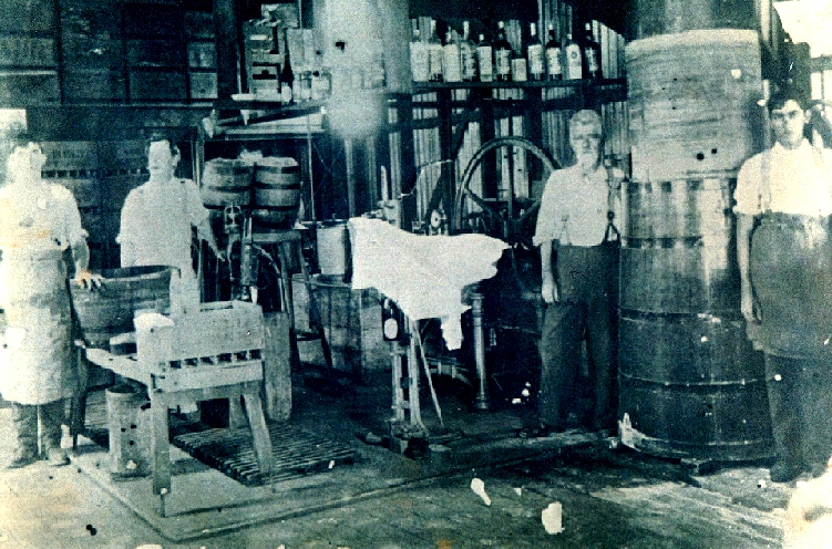 George Bell is wearing the white shirt and black pants, standing left of large barrel. Bell's brother-in-law, Ben Dunk, is dressed in white and stands second from left, partially hidden by work bench (face obscured although we can tell he has a moustache).
