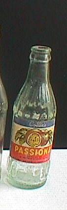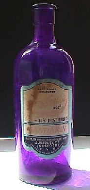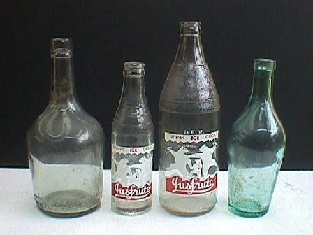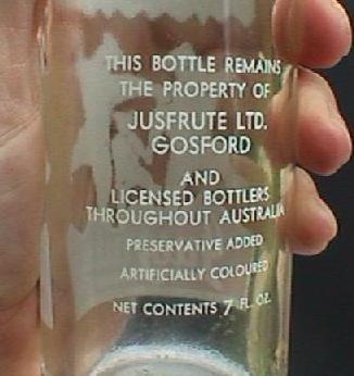 A. 26 ounce 'squat brandy shape'. Clear glass. Embossed around bottle at base: "THIS BOTTLE IS THE PROPERTY OF JUSFRUTE PRODUCTS LTD GOSFORD". Curved "A.G.M." on base. *Also available in 2 gallon Gosford flagon. Acid etched in large letters: "Jusfrute" (Not shown). *1 gallon Gosford Jusfrute flagon - unknown? B. 7 ounce. Ceramic transferred label. Label at back reads: "THIS BOTTLE REMAINS THE PROPERTY OF JUSFRUTE LTD. GOSFORD". (see close up below, left) C. 26 ounce. As above. D. 13 ounce. Clear glass. Embossed around bottle at base: "THIS BOTTLE IS THE PROPERTY OF JUSFRUTE PRODUCTS LTD GOSFORD". Curved "A.G.M." on base.