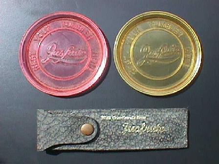 Jusfrute plastic drink coasters and leather holder for a Jusfrute bottle opener. |