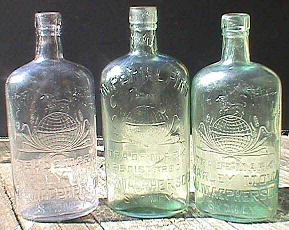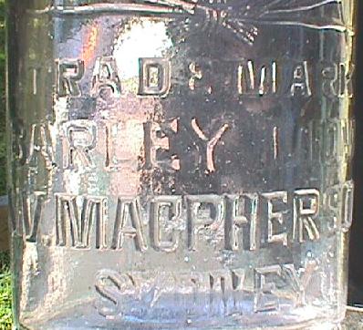 A. Imperial Pint. Amethyst glass, applied top. Rare. Embossed: "TRADE MARK BARLEY MOW W. MACPHERSON SYDNEY" (see close-up below). B. As above, except without "BARLEY MOW". Clear glass. Not rare. (Hard to find in amethyst, though.) Embossed near top: "IMPERIAL PINT". C. As for A. but clear glass.