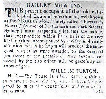 The first reference to this hotel that I have found is in 1831 - with reference to Catherine McLeod, Publican, Barley Mow, Castlereagh St. It is then listed through the years until 1889, when William Macpherson became the publican. He remained until 1914. The hotel was still operating in 1951, and at that time was called the Barley Mow Family Hotel.