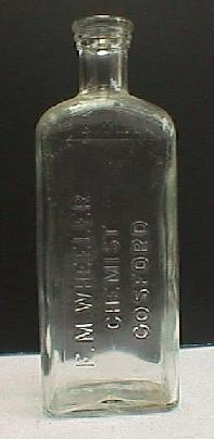 Left: "F. M. WHEELER CHEMIST GOSFORD" Machine-made bottle. Clear glass. "3.V.111." embossed on shoulder. (See close-ups below).