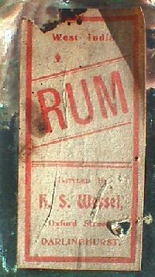 Paper label as found on reverse side of B. (as above). "WEST INDIA RUM BOTTLED BY R.S. WESSEL, OXFORD STREET DARLINGHURST'.