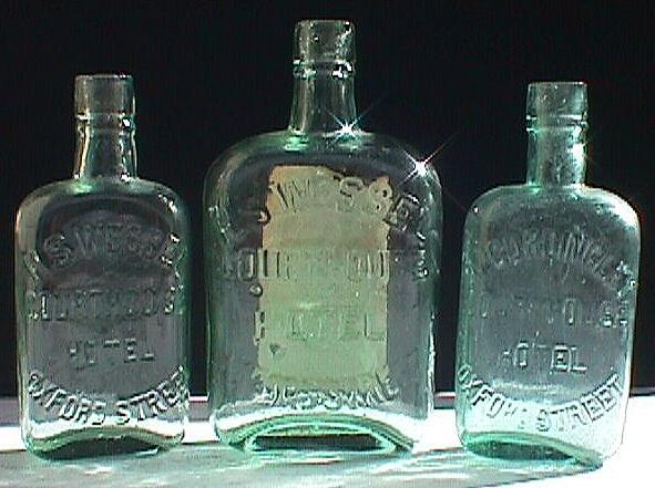 A. Imperial quarter pint flask. Clear glass, applied top. Rare. Embossed on front: "H.S. WESSEL COURTHOUSE HOTEL OXFORD STREET". B. Imperial half pint flask. Rare. Same features as above. (See below for close-up of paper label as found on back). C. Imperial quarter pint flask made for William Cordingley. To date this is the only size found but it is likely he had larger bottles as well. Clear glass, applied top. Rare. Embossed on front: "W.C. CORDINGLEY COURTHOUSE HOTEL OXFORD STREET".