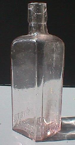 Quarter pint spirit bottle. Square sided and similar in appearance to a small schnapps. Clear, applied top. Extremely rare. Embossed on sides near base: "FITZ'S CRYSTAL PALACE HOTEL".