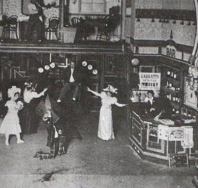 Circa 1905 publicity photo for a Sydney theatre production. Note the use of a prop which is an advertising sign for "Garratts Special Whisky" above the bar. |
