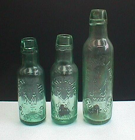 Above, Left to right: A. 7 ounce Lamont Patent. Clear glass. Embossed around bottle near base: "ROSS BROS. ERSKINVILLE SYDNEY" (see close-up below). B. As above, except embossing only on base: "K.B.C. 4783". This bottle was manufactured in England by the Kilner Bros. Company. (See close-up below) Note: Only eight of any 7 ounce bottle known to date. C. 10 ounce Lamont Patent. Clear glass. Embossed on base: "K.B.C. 4342". Only three specimens of this bottle known to date, with one broken.