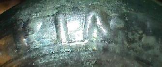 Close-up of "PINT" as found on back near shoulder of Imperial Pint flask. Faint embossing. |