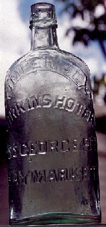 Left to right: A. Imperial Quart flask. Clear glass, applied top. Extremely rare. Embossed on front: "IMPERIAL LARKINS HOTEL 655 GEORGE ST HAYMARKET". On back: "QUART". B. Imperial Pint flask. As above, but "PINT" on back near shoulder. Only one example known to date. Somewhat difficult to photograph embossing.