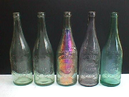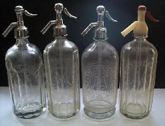 Selection of 30 ounce soda syphons. Varying acid-etched trademarks, with varying shaped sides.