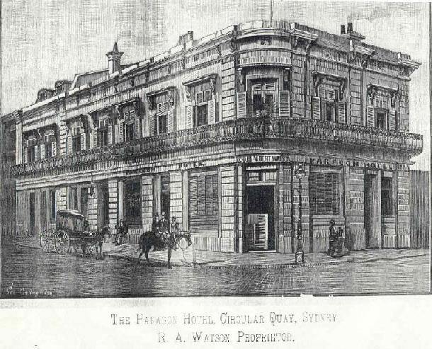 Built by Anthony Hordern, the Paragon Hotel opened on March 15, 1860. The first licensee was Mrs. Catherine Brown. In 1868, Mr. R.Q. Watson (born April 1, 1839 in Halifax, Canada) became the second licensee. Watson's father, John, was a shipbuilder in Halifax. At the same time R.Q. Watson was educated in Halifax at the Acadian School. R.Q. graduated and worked with the newspaper The Christian Messenger, where he remained until 1859. With desire to see the world and do better than his prospects in Halifax, he set out and eventually landed in Sydney on April 3, 1860. He started working with The Empire newspaper. Started by Sir Henry Parkes, it was owned by Messrs Hanson and Bennett when Watson joined the ranks. He remained for eight years, until he was able to work independently as joint proprietor of the Christian Pleader newspaper. With Mr Alfred Allen, they also ran a general printing office in George Street. They were successful in these ventures and in 1868 Watson became proprietor of the Paragon Hotel. He became a very respected and popular publican at the Quay, appealing to the higher classes. He was an ardent supporter of sports of all kinds, especially aquatic sports. He had deep interests in the wine and spirit trade and became President and Treasurer of the Licensed Victuallers' Association and the Trade Defense Association. He was successful in making several reforms to the licensing laws within his state. Besides his business at Circular Quay, Watson had invested in gold, silver, copper, coal, tin and petroleum in NSW. He also had large investments in Queensland and New Zealand. He was associated with Sir Alexander Stuart and Sir Peter Scrotchley, and together they introduced to NSW the diamond drill bit used in mining. He remained publican until his death on September 23, 1904. His son, W.H. Watson, then took over as licensee. The Paragon Hotel is still in operation today.