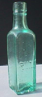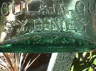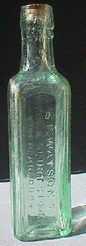 Four ounce spirit bottle (shaped like a coffee essence bottle). Clear or amethyst glass, applied top. Rare. Embossed on front: "W.H.WATSON WINE & SPIRIT STORE CIRCULAR QUAY". |