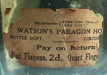 A. Imperial Quart. Clear glass, applied top. Rare with "1923" embossed on front: "W.H.WATSON'S BOTTLING DEPT PARAGON HOTEL CIRCULAR QUAY SYDNEY 1923". (see close-up below). Note: Embossed near base with "1919" or no dates at all - common. B. Imperial Pint. As above, but no embossed date. |