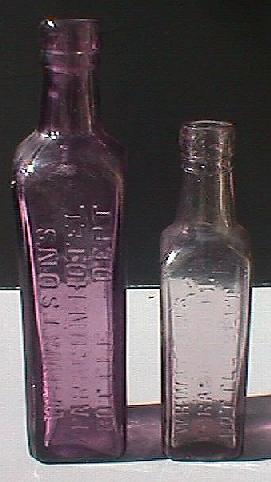 A. Eight ounce spirit bottle (larger coffee essence shape). Amethyst glass, applied top. Rare. Also available in clear glass. Embossed on front: "1/- RUM 1/-". On back: "W.H. WATSONS BOTTLE DEPT CITY". B. Amethyst 4 ounce spirit bottle (coffee essence shape). Clear glass, applied top. Rare. Embossed on front: "6d RUM 6d". On back: "W.H.WATSONS BOTTLE DEPT CITY". |